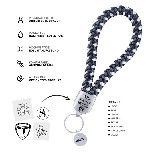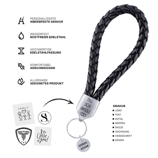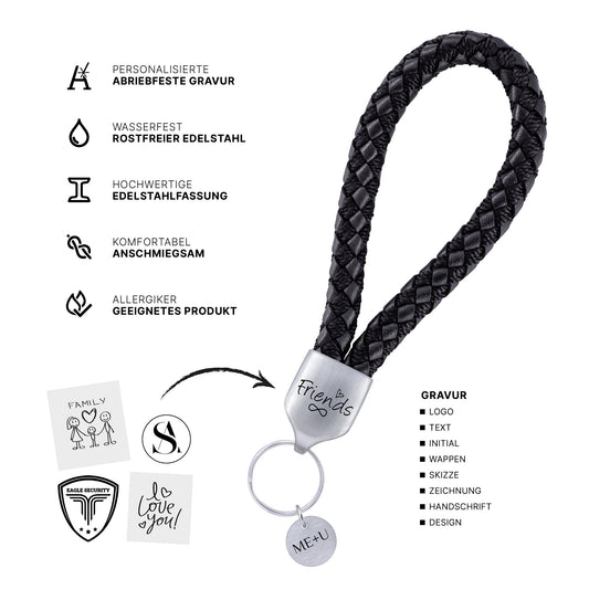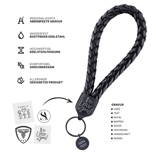 Schlüsselanhänger mit Gravur - Leder geflochten schwarz