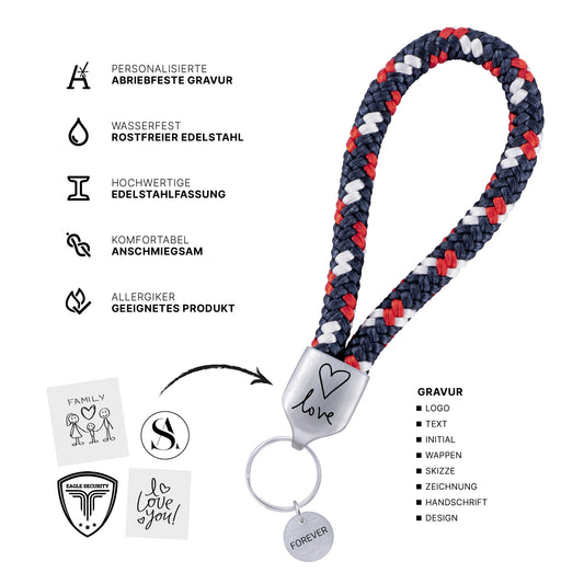 Schlüsselanhänger mit Gravur - Segeltau Blau-Rot-Weiss