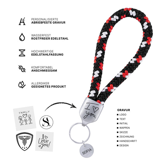 Schlüsselanhänger mit Gravur - Segeltau Schwarz-Rot-Weiß